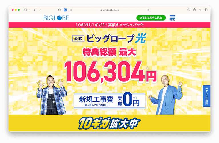 ビッグローブ光の公式窓口「ビッグローブ」は、25,000円の基本キャッシュバックを実施中です!