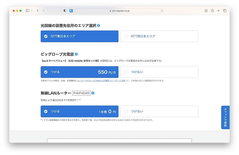 「ビッグローブ光電話」をつけるかどうか選択する