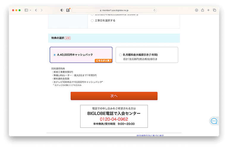 特典の選択(キャッシュバックがおすすめ)