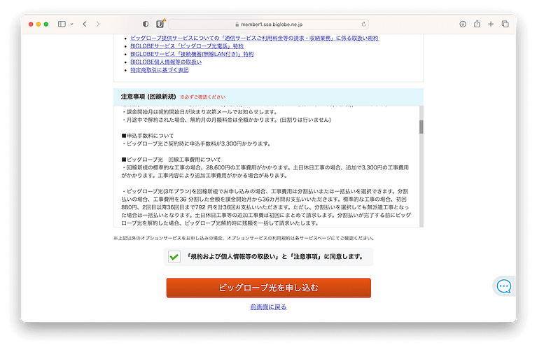 入力内容を確認して問題なければ「ビッグローブ光を申し込む」をクリック