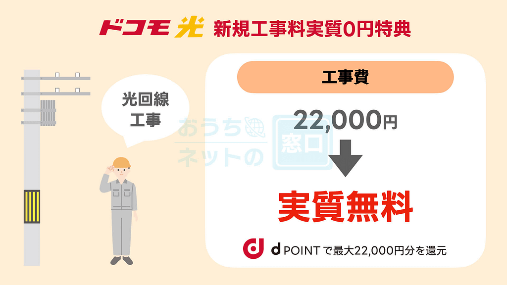 | 概要 | 工事費が実質無料 (新規工事料相当のdポイント22,000円分をプレゼント) |