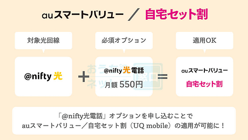 ただし、auスマートバリュー/自宅セット割を適用させるためには、@nifty光の@nifty光電話(550円/月〜)の加入が必要です。