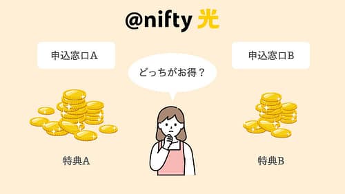 どの窓口を選んでも月額料金や品質は一緒であり、@nifty光の共通特典は必ず受けられるので、一番お得な窓口を選びましょう!